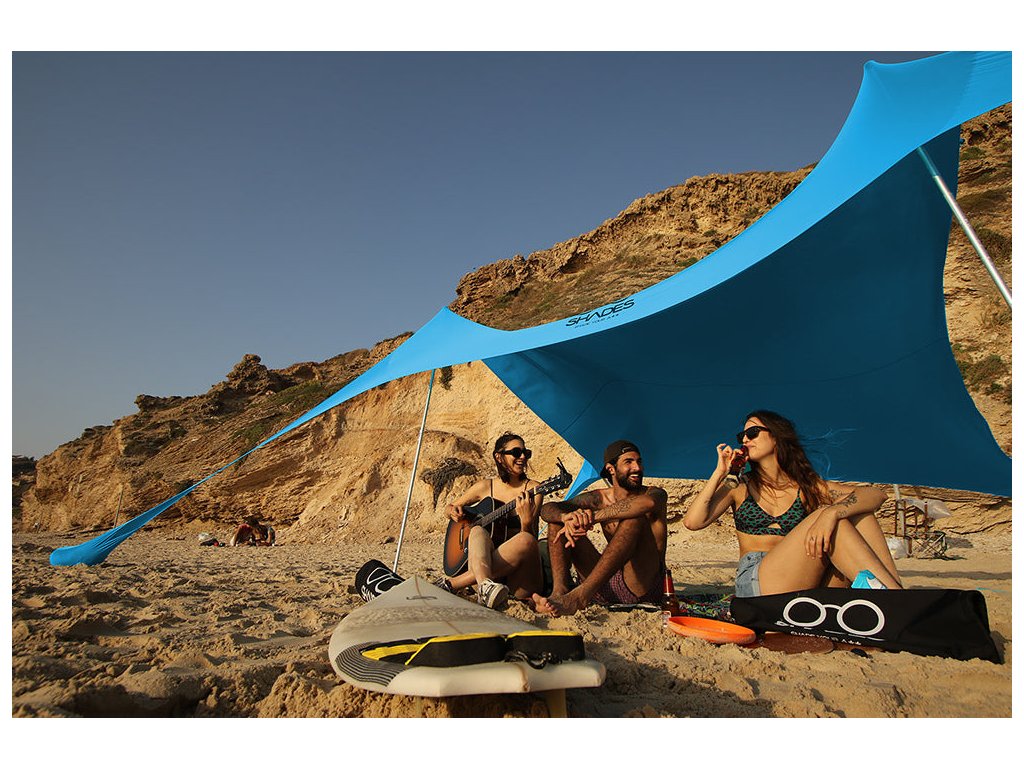 Plážové stany Shades jsou navrženy tak aby snadno a rychle poskytli jedinečné stínění nejen na pláži. Jsou vyrobeny z italské látky Lycra a poskytují 98% UV ochranu.